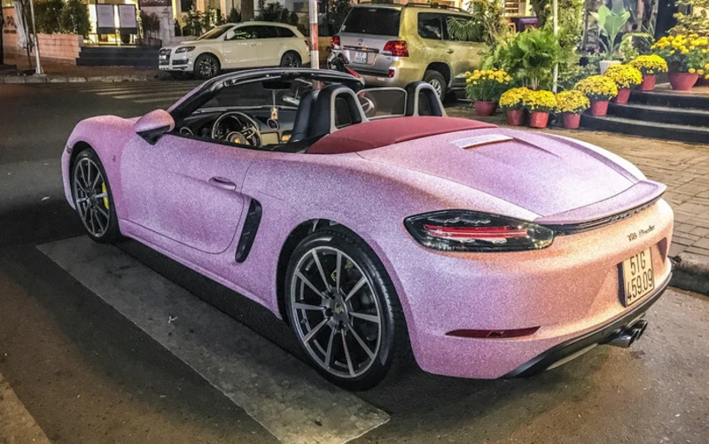 Mẫu roadster này nổi bật với lớp sơn hồng cánh sen hiếm gặp, tông màu ít xuất hiện trên các dòng xe Porsche tại Việt Nam. Đi cùng ngoại thất hồng nhạt là mui xếp mềm màu xanh dương, tạo nên tổng thể tương phản, trẻ trung và mang đậm cá tính cá nhân của chủ xe.